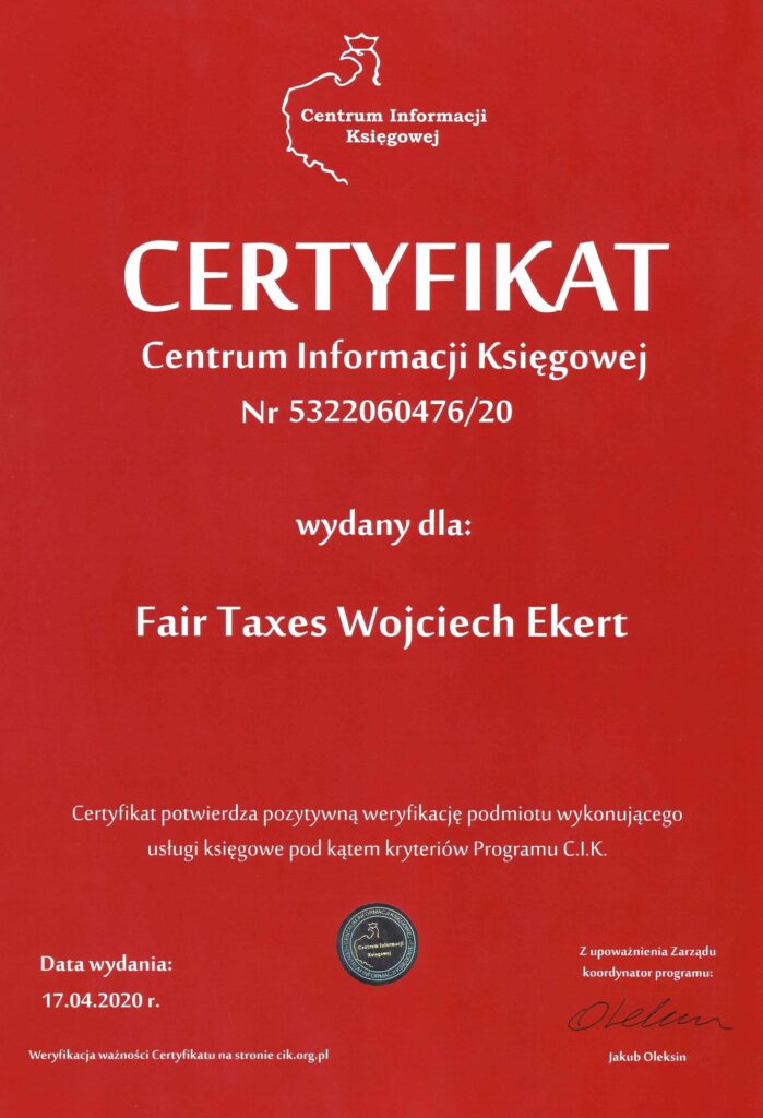 oraz posiadam Certyfikat wydany przez Centrum Informacji Księgowej.